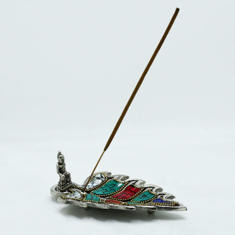 La conception de ce porte-encens décoratif puise ses inspirations dans la riche tradition bouddhiste tibétaine. La feuille représente le cycle de la vie et de la renaissance, tandis que la présence du Bouddha évoque la recherche de l'éveil spirituel. Les couleurs choisies ne sont pas anodines : le turquoise symbolise la sagesse, le rouge la compassion et le bleu la méditation profonde.