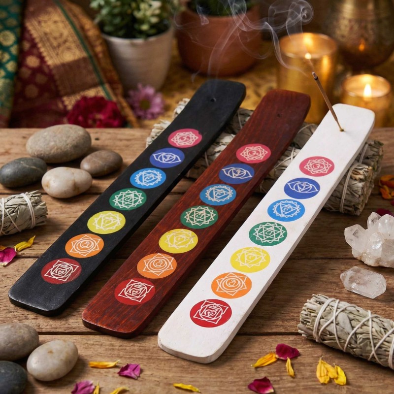 Ce superbe porte-encens chakra unit fonctionnalité et spiritualité dans un design élégant. Conçu en bois de manguier authentique, il présente les sept symboles chakras aux couleurs vibrantes, représentant les centres énergétiques essentiels du corps humain.