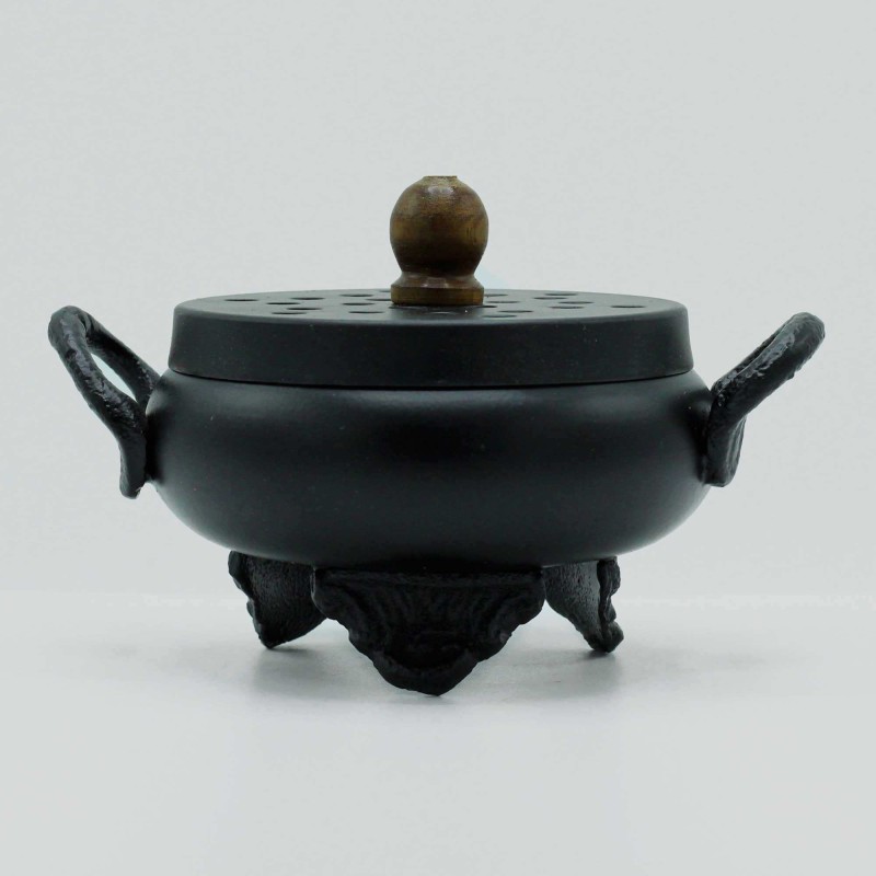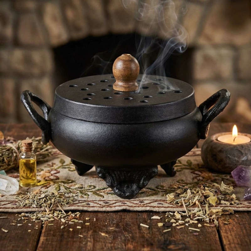 Ce superbe brûleur d'encens en forme de chaudron traditionnel apporte une dimension mystique à vos pratiques spirituelles. Fabriqué en fonte robuste avec un couvercle perforé et une poignée en bois, il allie authenticité et fonctionnalité pour une expérience d'encensement unique.